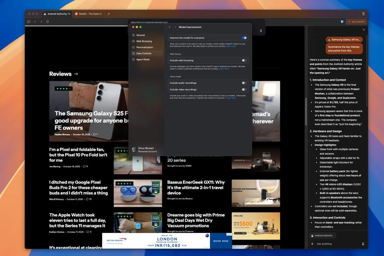 با این حال، اطلس پتانسیل آن را دارد و اینکه سفرها را برنامهریزی کند، خواربار بخرد یا در حین کار خلاصهای از آموزشها را ارائه دهد، اجتنابناپذیر به نظر میرسد. اطلس تنها اولین گام به سوی آن آینده است. حافظه مرورگر (Browser Memory) اطلس یکی دیگر از ویژگیهای کلیدی است. هنگامی که این قابلیت فعال شود، چتجیپیتی عادات مرور و موضوعات مورد علاقه شما را به یاد میآورد، بنابراین میتواند کار را از جایی که متوقف شده بود از سر بگیرد. میتوانید این قابلیت را هنگام نصب غیرفعال کنید. بهصورت پیشفرض، اوپنایآی از این دادهها برای آموزش مدلها استفاده نمیکند که این کمککننده است، اما کمی زمان میبرد تا برای کاربر عادی شود.