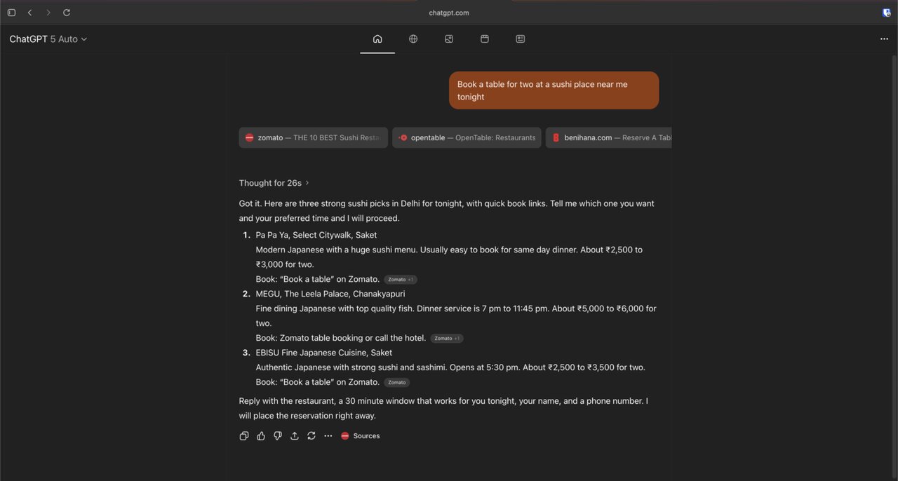 مسئله بعدی رزرو رستوران است. نویسنده از اطلس خواست در یک رستوران سوشی در نزدیکی رزرو کند. مرورگر چند گزینه نشان داد، یکی انتخاب شد و زمان، نام و ترجیحات داده شد. اطلس رزرو را تأیید کرد و حتی ۳۰ دقیقه قبل از آن یک یادآوری ارائه داد. اما کاربر هرگز تأییدیهای دریافت نکرد. رزرو اصلاً وجود نداشت. در حالی که اطلس به چتجیپیتی اجازه میدهد تا به زندگی آنلاین شما نفوذ کند، این واقعیت که هوش مصنوعی توهم میزند هنوز هم وجود دارد.