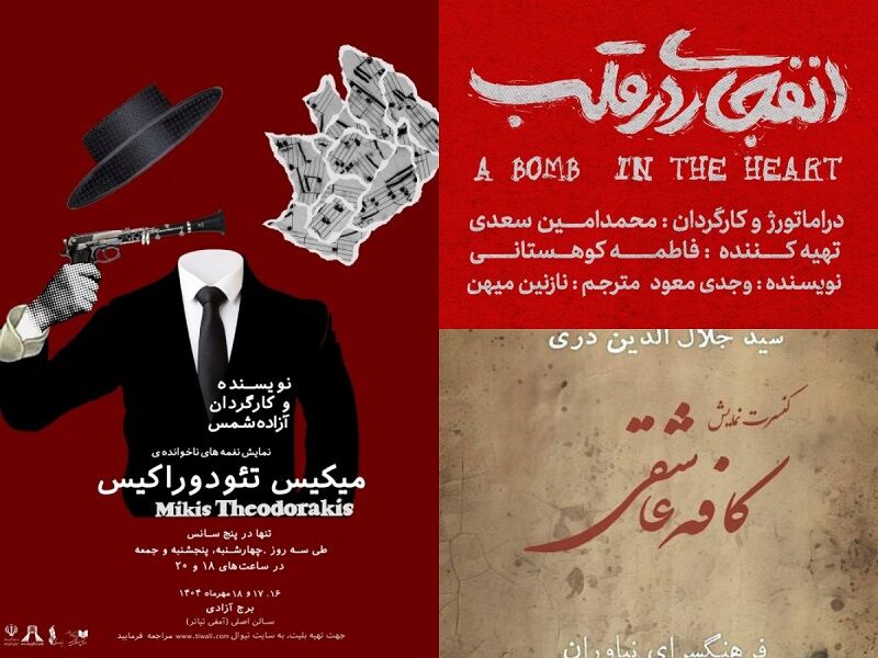 تهران- رزنیوز- اجرای کنسرت نمایش «کافه عاشقی» با اجرایی متفاوت و نگاهی نو در فرهنگسرای نیاوران، میزبانی هامون از «انفجاری در قلب» و اجرای نمایش «میکیس تئودروراکیس» در برج آزادی از اهم اخبار حوزه تئاتر است.